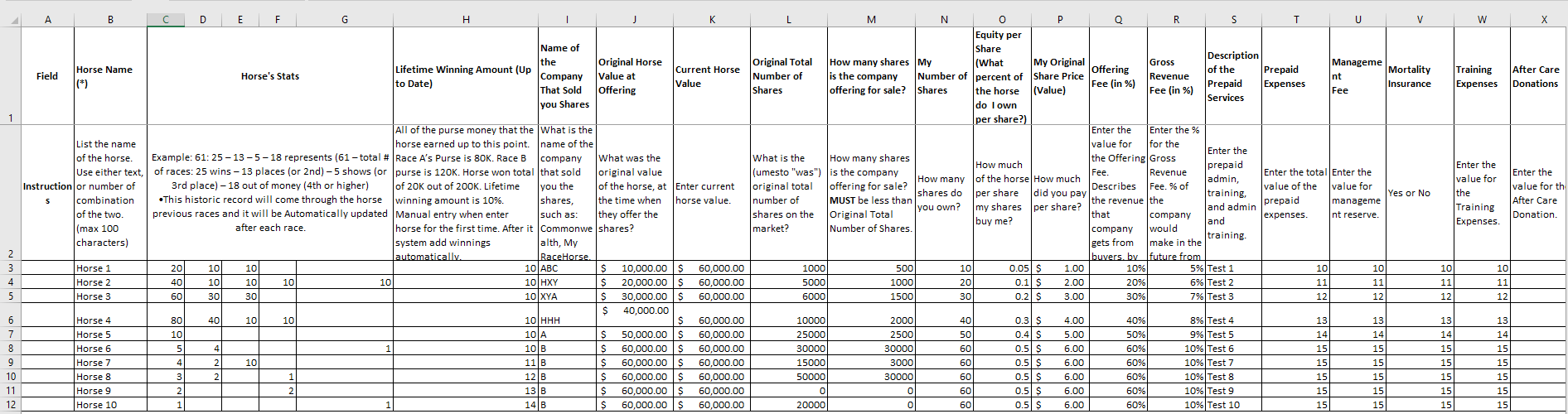- Company's Equity in Horse in % (from 0-100%) 50.00%, this field will tell you the company equity in horse in