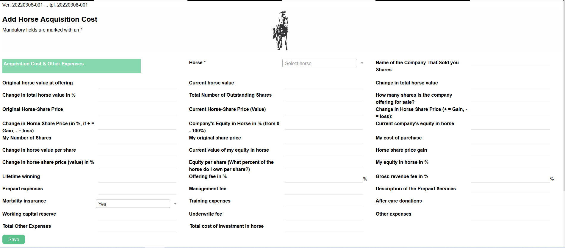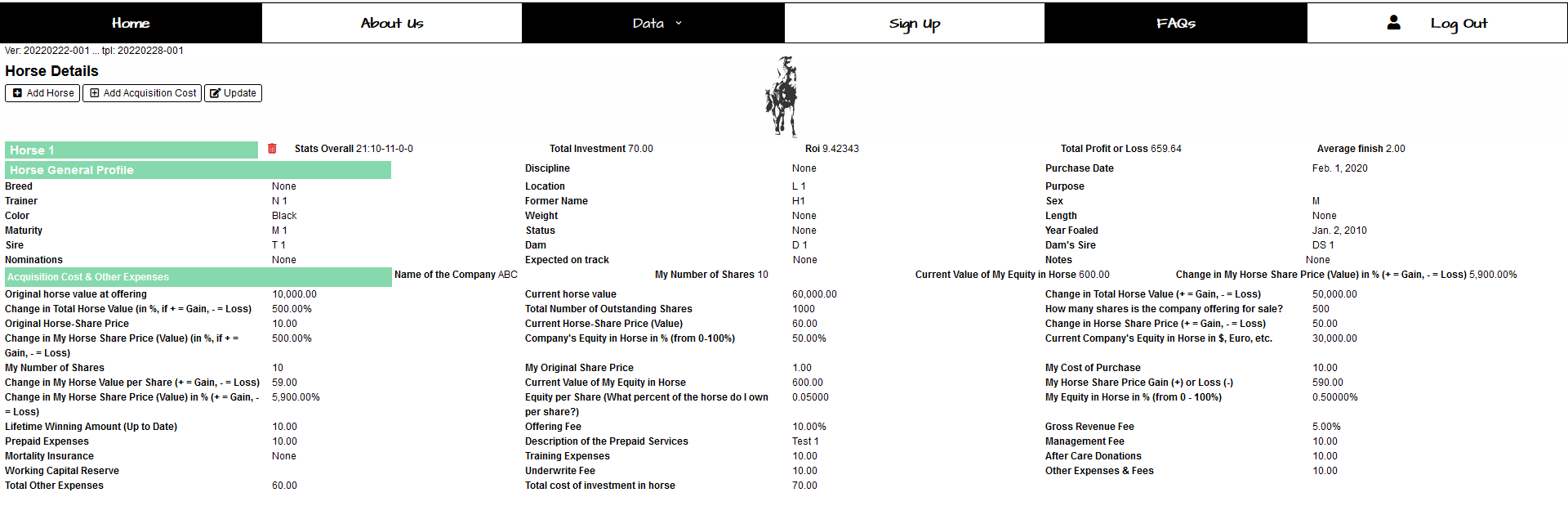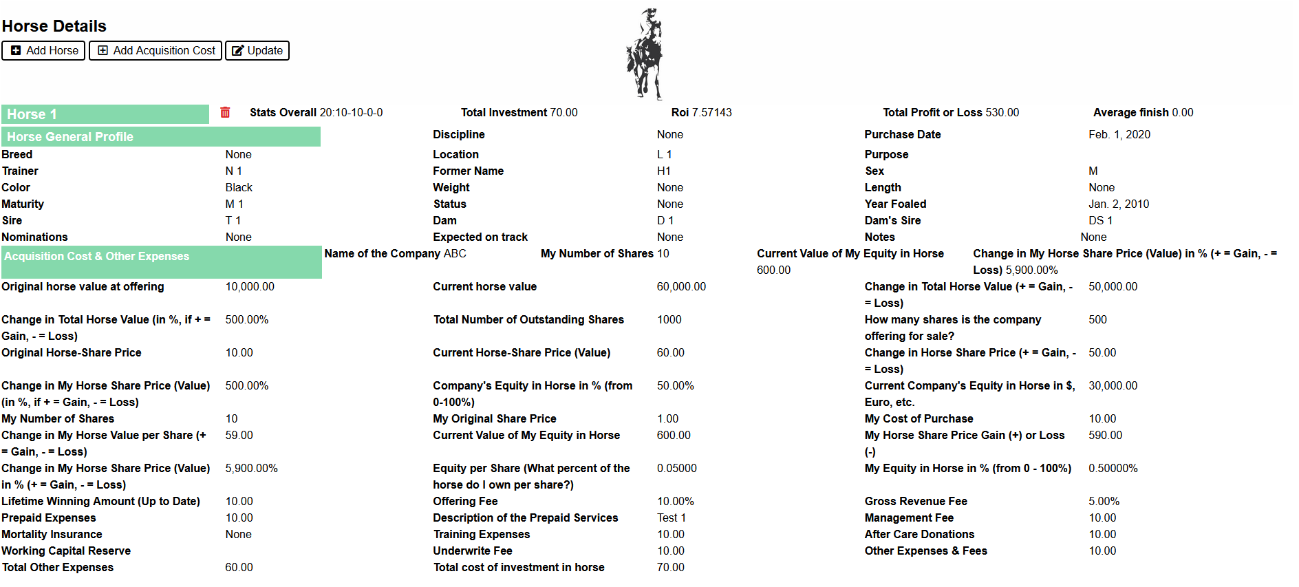 related to the horse’s name, origin, age, etc. “Acquisition Cost & Expenses” display information related to the
