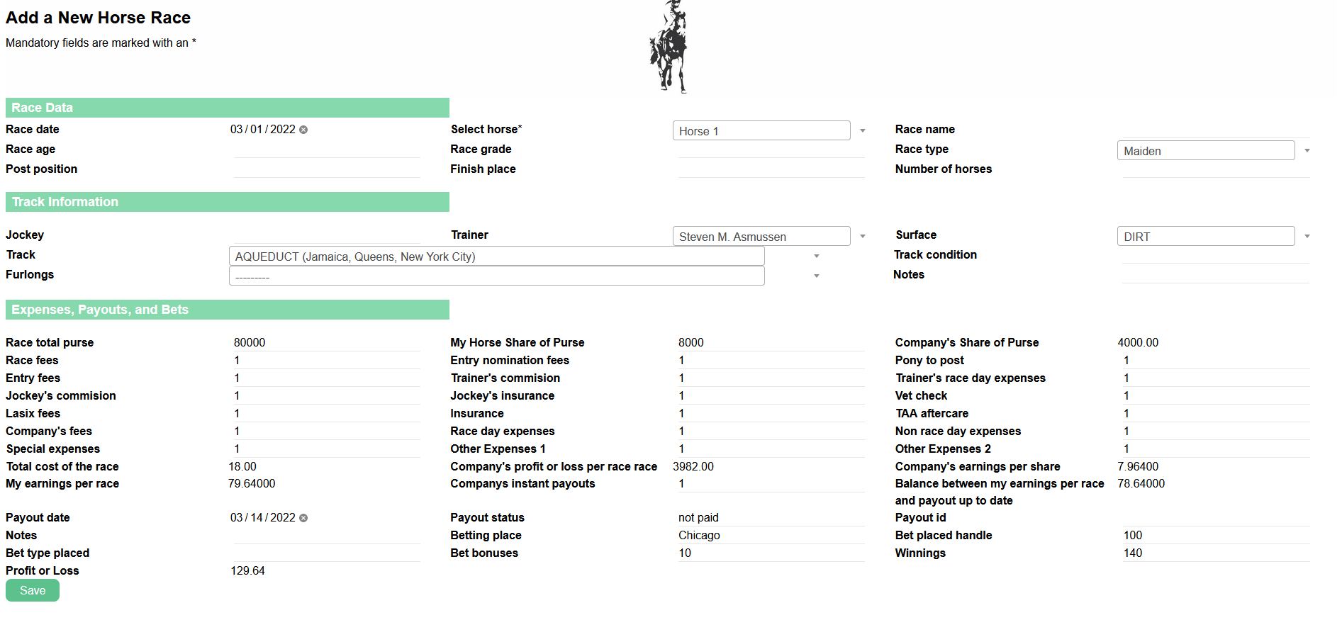 - Jockey, enter the name of the jockey.